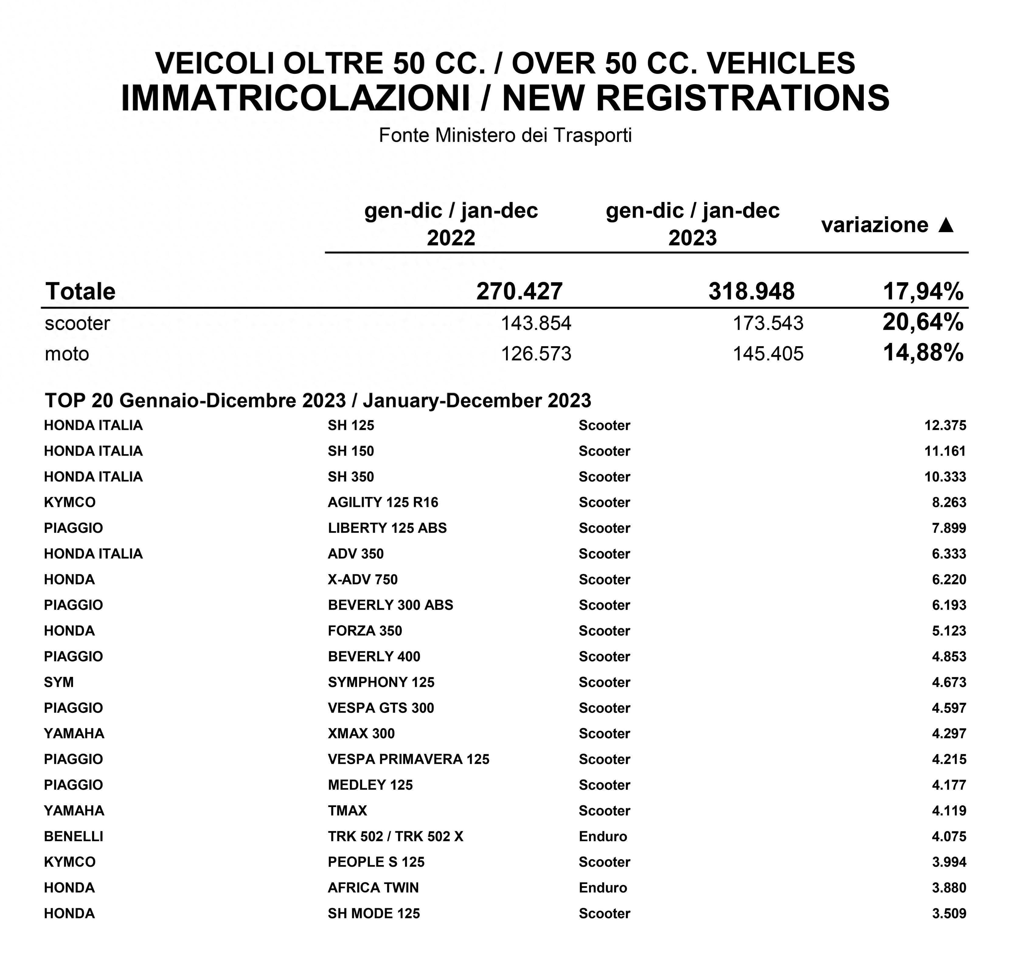 一月 3 日的时候,ANCMA (Associazione Nazionale Ciclo Motociclo Accessori,意大利全国摩托车配件协会)发布了 2023 年度、意大利摩托车市场的新车销售数字:2023 年全年新车注册登记数量超过了 337702 辆,比 2022 年增长大约 15.7% 。这也是自 2010 年、美国次贷危机所触发的市场波动以来,新车注册数量最好的一年。