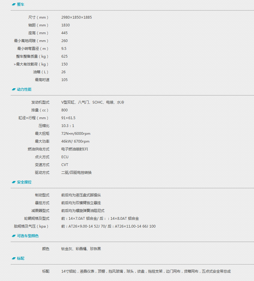 800cc、V型双缸、八气门、单顶置凸轮轴、电喷水冷发动机,功率达到46kW,动力强劲,性能卓越。