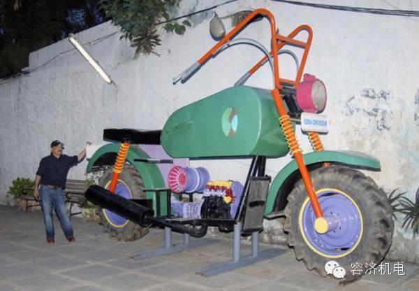 亚达夫设计的超大号摩托车。凭借自己设计制造的汽车,亚达夫创造了一项吉尼斯世界纪录。此外,他的大名还入主印度版世界吉尼斯大全《林姆卡纪录大全》。
