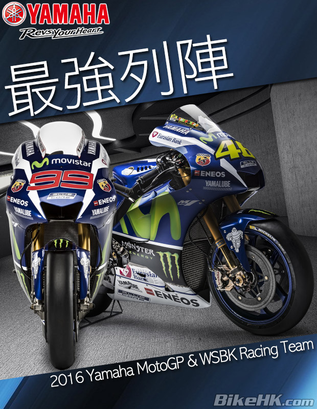 Yamaha于西班牙巴塞隆拿发布了2016年的赛车队阵容,今次先来介绍大家最关心的MotoGP车队及WSBK车队吧!今年的MotoGP车队由Movistar冠名赞助,车队名为Movistar Yamaha MotoGP Team。至于WSBK赛事方面,Yamaha以R1M迎战SBK及STK1000组别,两支车队分别为Pata Yamaha Official WorldSBK Team及Pata Yamaha Official STK1000 Team。