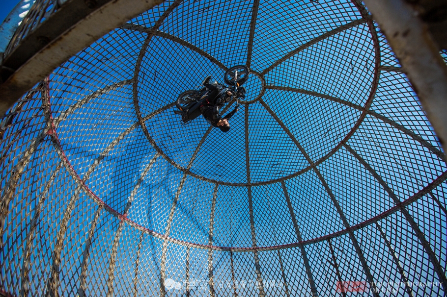 成曾辉在开始前特意交代工作人员,等他行驶至球体上半圈时可以打开进出的门,这样方便我拍摄。我也是再三确认这样是否安全, 成曾辉很自信的说没问题。当钢球门被打开,看到里面飞驰的摩托车时,我被深深的震撼到,这种视觉冲击力远远超出在球体外的观感。