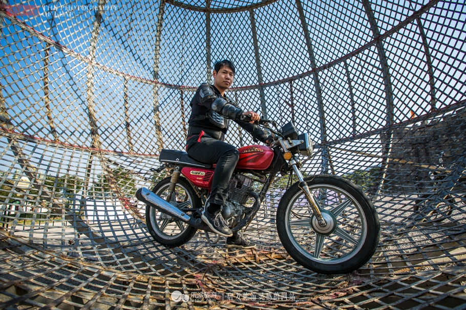 交谈中了解到,成曾辉是江西人,练习环球飞车有十几年了。他从一开始便选择勇敢者的游戏,从未丢弃对高难度技巧的追逐。他把竞争对手指向了自己,试图通过缩小铁笼空间、增加飞车手来挑战自我。他的目标是吉尼斯世界纪录。