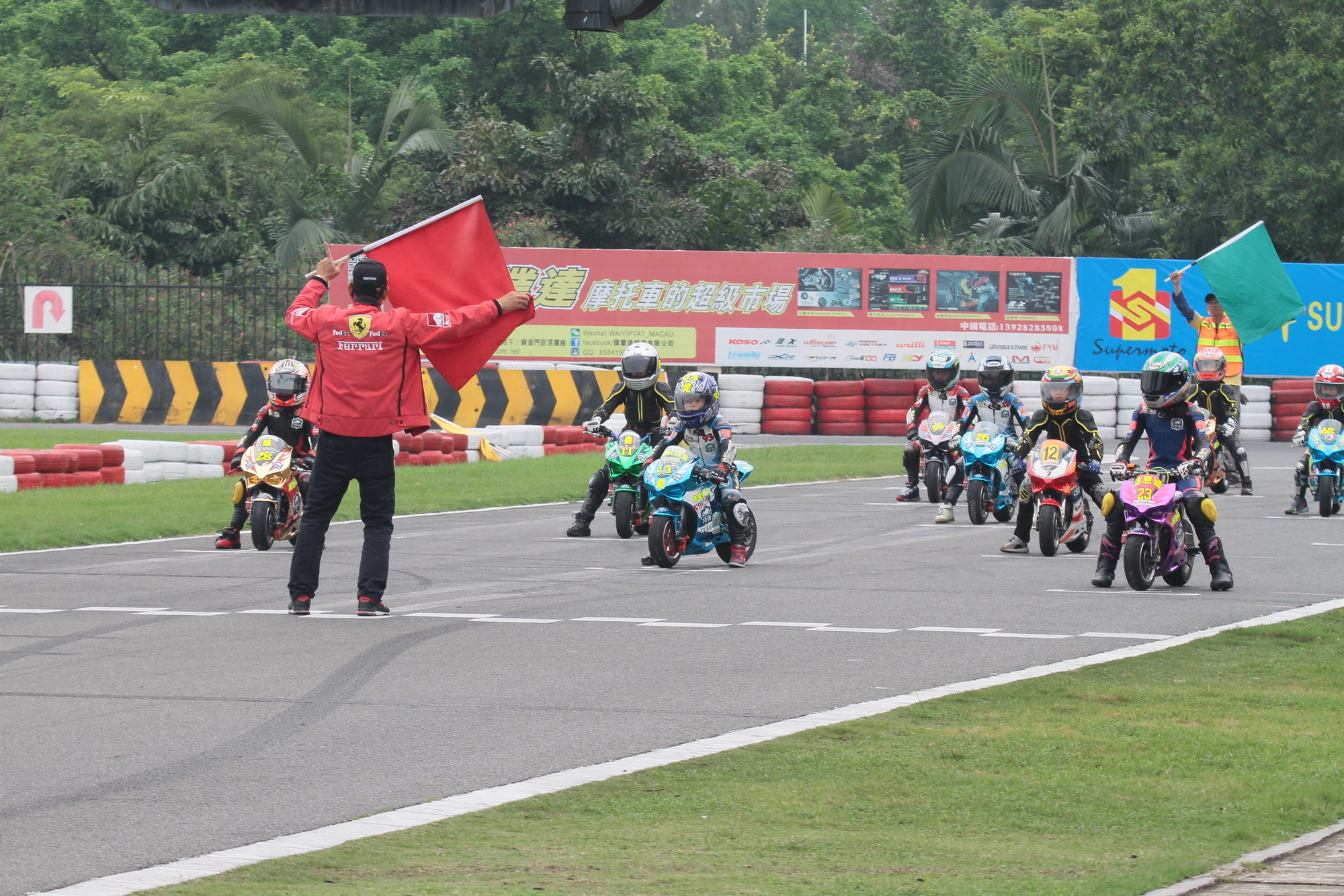 上午十点正式开始决赛第一回合,由于太过紧张杆位起跑的23号汤恩媛起步死火,全部小车手都顺利发车,当汤恩媛再次启动车子的时候,大队都已经跑到300米以外了,此时汤恩媛只能奋起直追,尽量去追回最后一位发车的劣势。此时第二位发车的93号龙俊豪和第三位发车的28号马健豪,还有12号邓圣贤已经形成第一集团的优势遥遥领先。