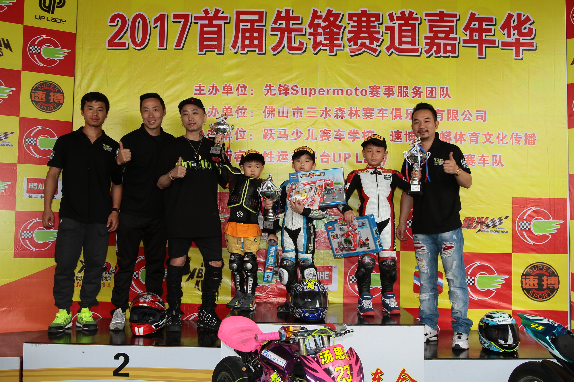 下午三点半小车手们午休之后继续比赛,第二回合的比赛23号汤恩媛一路领先以稳定的状态再次刷新了自己的最快圈速1分19秒2的成绩冲过终点,顺利夺得A组冠军,93号龙俊豪紧追其后以1分18秒9的儿童组最快单圈夺得B组冠军。