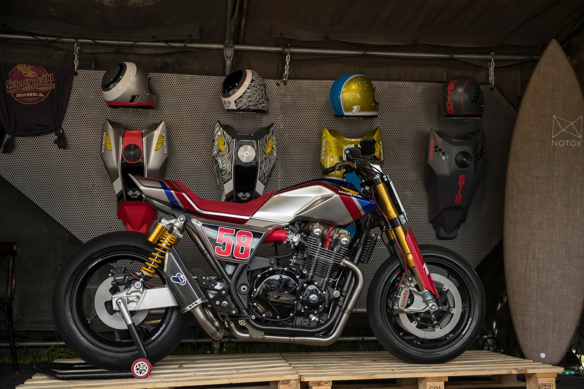 而来,采用了红、白、蓝色 HRC 配色方案的美国已故车手海登(Nicky Hayden)纪念定制车。以及早前就已经发布了的,贴有意大利车手施蒙切尼 58 号图案的 CB1100TR 概念车。