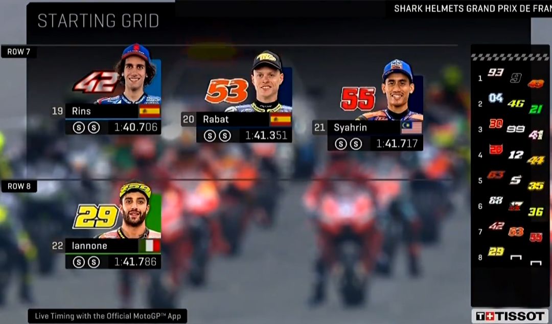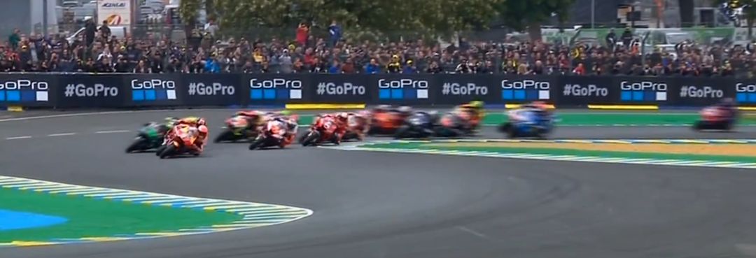正赛依旧是阴沉的天气,无论气温还是赛道温度都不到20℃,如此低的温度也间接导致了在暖胎圈就有两位车手摔车,这在一般的比赛中是很少见的,两位车手也算交学费了。起跑之后小马依旧是常规领先,身后是Petrucci和Jack,一圈后小马第1,Petrucci第2,Jack第3,罗西上到第4,莫比戴利第5,KTM的小E上到第6,多维第7,洛伦佐第8,维尼第13。