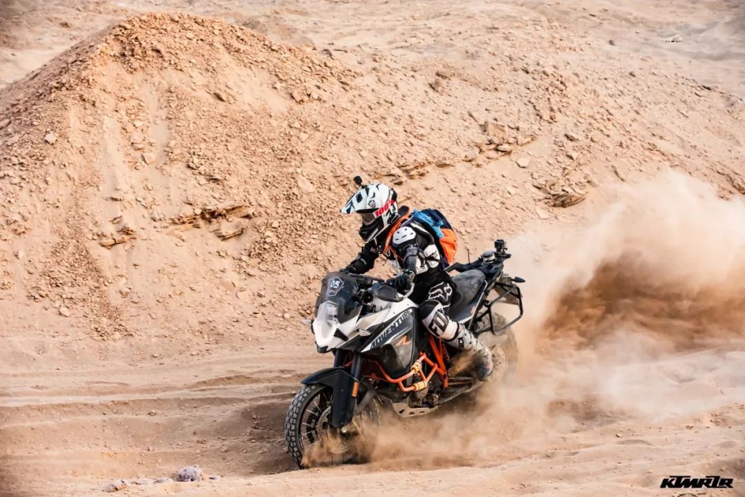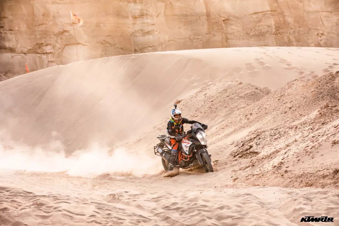 艰难驶出沙漠路段,近60度的陡峭高坡成为拦路虎。坡上覆盖着细软沙子和大石块,加上深浅不一的坑,车身容易产生剧烈摇摆。车手此时需要小臂放松控制住车把,利用核心力量调整方向,KTM源源不断的强劲动力有信心保证车手顺利通过。