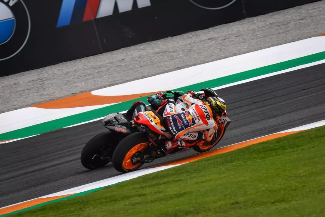 到比赛的后段,马昆斯在前面的领先优势已经超过了 1 秒,后面紧跟着的寇塔拉罗、以及不远处的米勒,似乎也没有要冒险逼近发动攻击的样子。反而是第四位之争,杜维斯奥索(Andrea Dovizioso)与林斯,两人几乎就是全场的近身追逐。