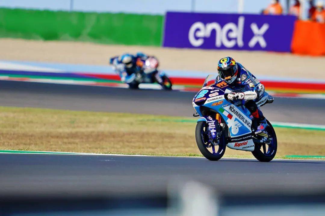 在 Q2,阿科巴跑出了更快的 1 分 42.808 秒拿到了第八,与头车的 1 分 42.403 秒圈速、仅仅相差 0.405 秒。这让他有机会成为了今天 Moto3 级别正式比赛里的主角。