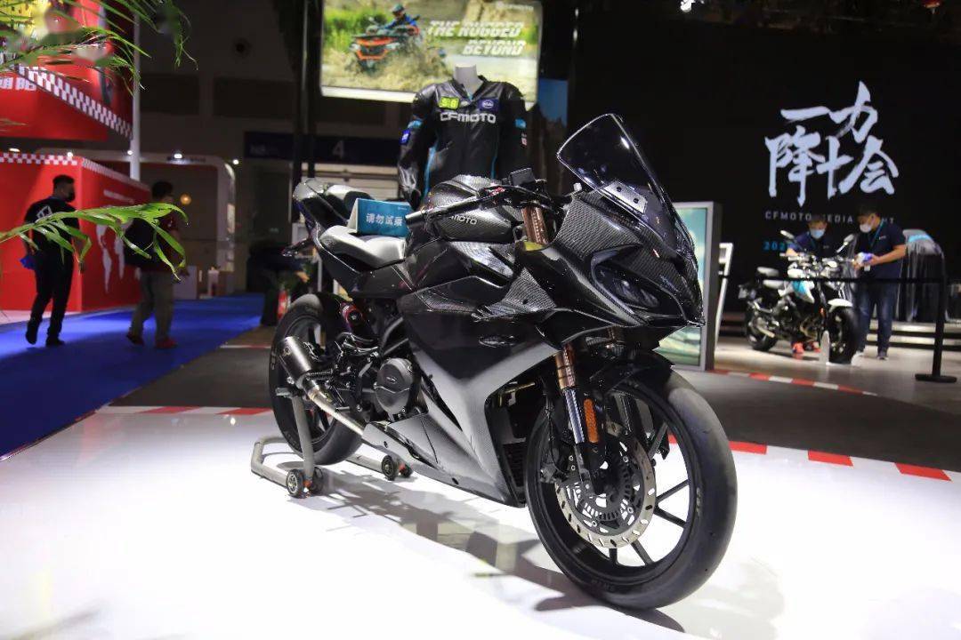当然现场还少不了时下最火爆,上市半年订车还要排队的250SR,这次展出的是250SR赛道改装版,赛道改装版采用碳纤维水转印材质工艺改色,搭载法斯特比赛专用前、后减震,并配有春风原厂上联板手把套件、升高脚踏、竞技风挡等,相信很多250SR车主已经想要加入购物车了,只不过250SR部分改装件的上市也和250SR一样,要等一段时间。