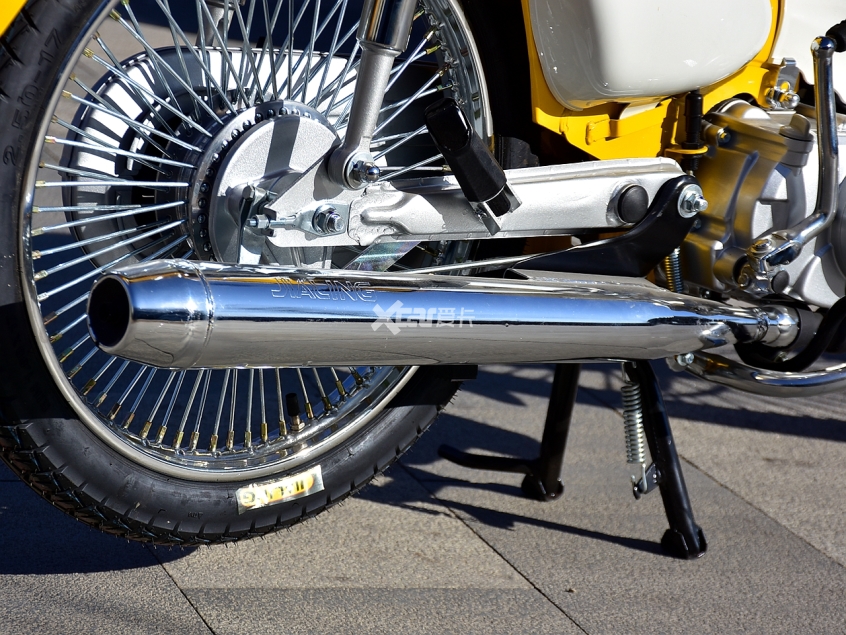 前后17寸的钢丝辐条圈给人带来了十足的怀旧感,交错编织的辐条主要是为了提升视觉效果服务,实际上这类车型如果能够匹配铝合金轮圈会更有实用性,买菜的路上会更加安心;其轮胎规格为前2.50-R17,后2.50-R17。
