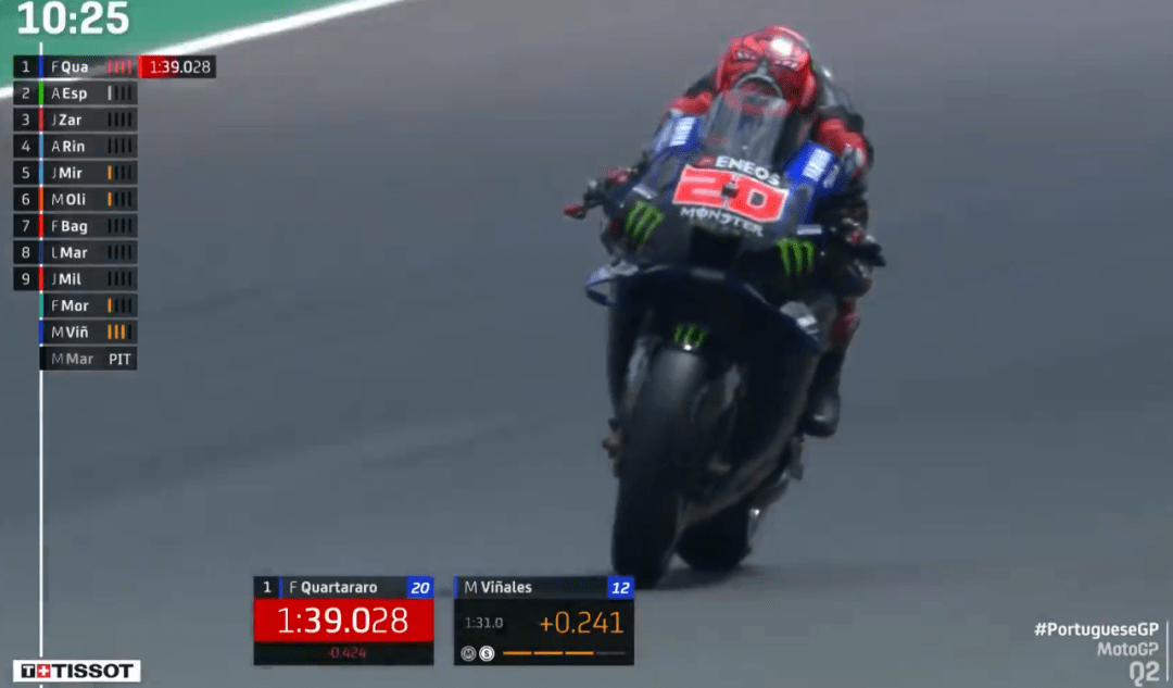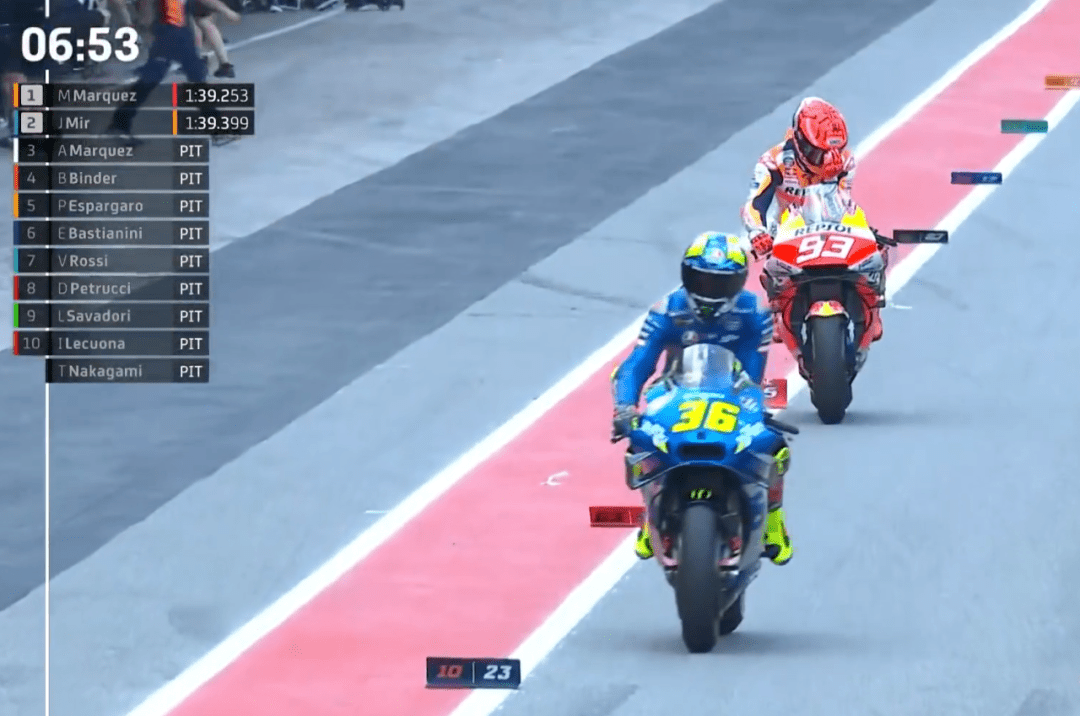 经过三场练习赛,小Q最快,Mir又要从Q1起跑,杜卡迪全员进入Q2,形成反差的是本田全员从Q1开跑,而雅马哈只有罗西从Q1起跑,罗老板又开始佛系了。小马去年因伤没跑这条赛道,所以Q1上来,小马就跟着Mir跑,Mir也没在意,直接刷了个第1,第二圈小马还跟,这一次小马挤下了Mir上到第1,Mir一看这是跟定我了,无奈直接回P房了,小马一看你回去我也回去,俩人跑了成双成对回到了P房。