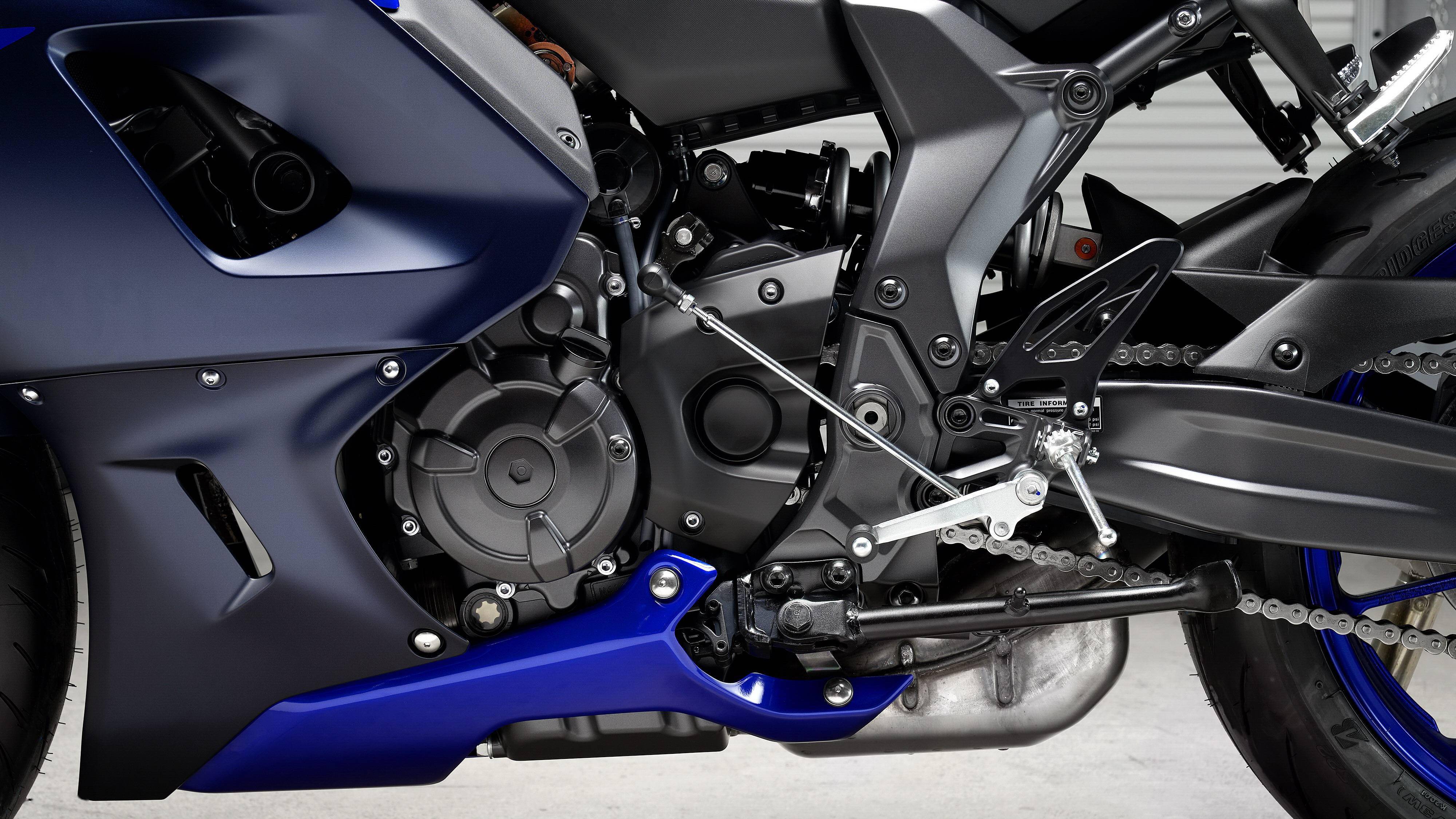 新一代的 YZF-R7 搭载一副来自 MT-07 同平台的水冷四冲程直列两气缸、DOHC 每气缸四气阀的 CP2 发动机,排气量 689 cc,最大动力输出 54 kw(约 73.4 匹)/8,750 rpm,比运动街车 2021&apos MT-07 的 55 kw(约 74.8 匹)略低。符合欧五排放标准。