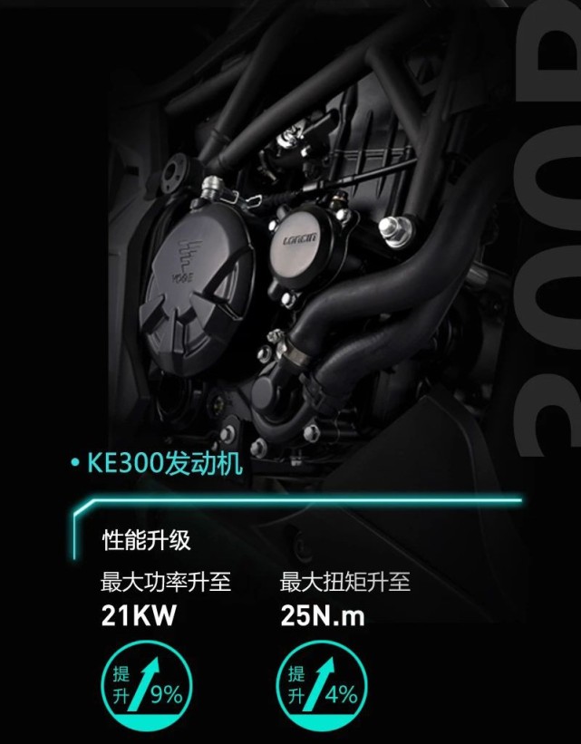 除了此之外,其他部分基本上与老款保持一致,依然搭载KE300单缸水冷发动机,最大功率21kw/9000rpm,最大扭矩25Nm/7000rpm,仅有164Kg的整备重量让这台车操控起来非常的灵活,780mm的座高让这台车对身高的要求也不高。