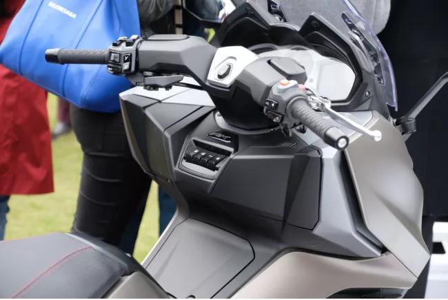 舱内,KYMCO也针对AK550的KEYLESS开关进行小改升级,从先前的旋钮式开关改为近年流行的一键式启动按钮,下方也配置一排功能按键,分开的开关按键布局,也让座舱内看起来更为简洁。