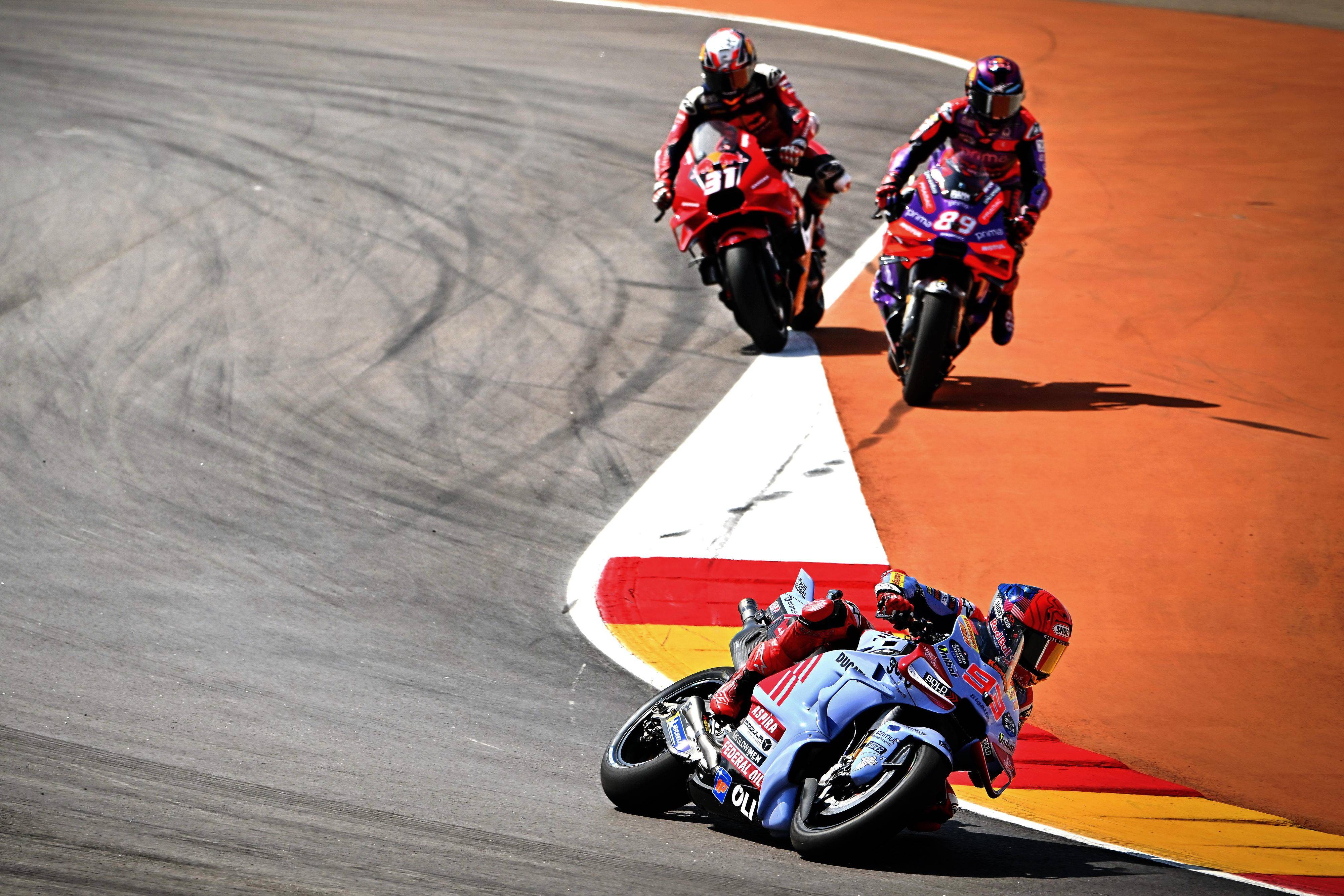 阿拉贡赛道去年重铺路面,缺席了 MotoGP 2023 赛季的比赛,重铺之后的赛道路面、沥青仍在固化中,因此车手们的反馈是比其他的大多数分站赛道都要滑。尽管如此,采用逆时针跑、有着更多左弯(5.08 公里的赛道,有十个左弯、七个右弯)的阿拉贡赛道,仍是非常适合马昆斯那种极限倾角压弯的标志性骑行风格,Q2 排位赛的圈速比第二名领先达 0.84 秒,从 Sprint 冲刺赛到正式比赛,都比采用最新 GP24 赛车的第二名、积分榜的领先者马丁(Jorge Martin),分别获得了 2.961 秒、4.789 秒的优势,且在这一站的两轮角逐中,后车几乎从未对他构成真正的挑战,堪称是阿拉贡之王的王者归来。