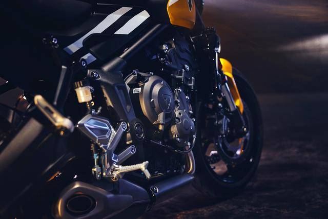 2025 Trident 660 三叉戟沿用了现行款水冷四冲程直列三气缸、DOHC 每气缸四气阀的发动机,缸径、行程为 74 mm x 51.1 mm,排气量 660 cc,最大动力输出 60 kw(约 80 匹)。与现行的版本相比,2025 款的动力单元没有变化。