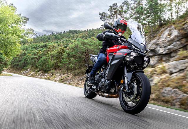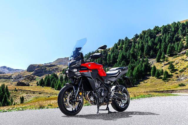 * 带有两个后侧边箱,属于最高配置版本、标配了手自一体变速齿轮箱的 Tracer 9 GT +,工厂型号为 MT09ATRDXCS。