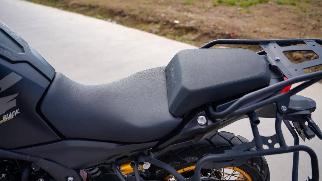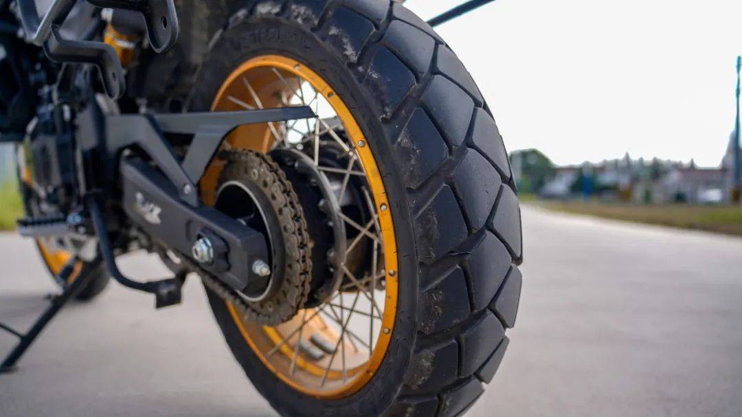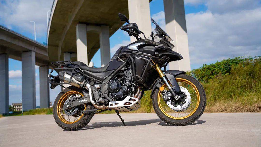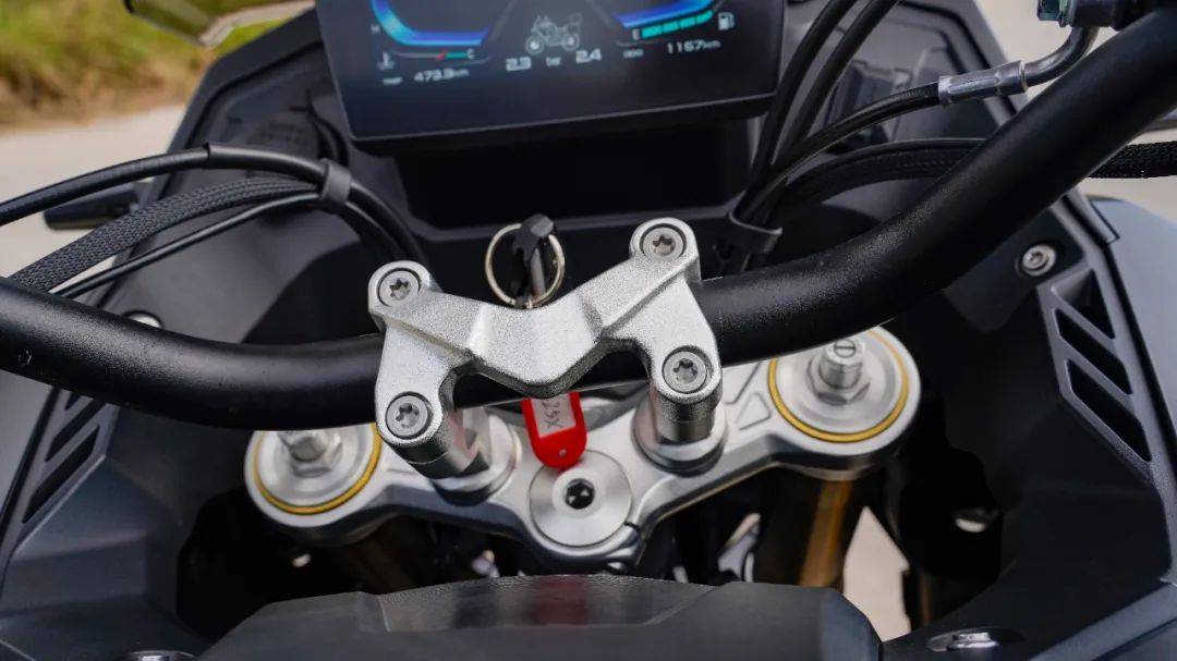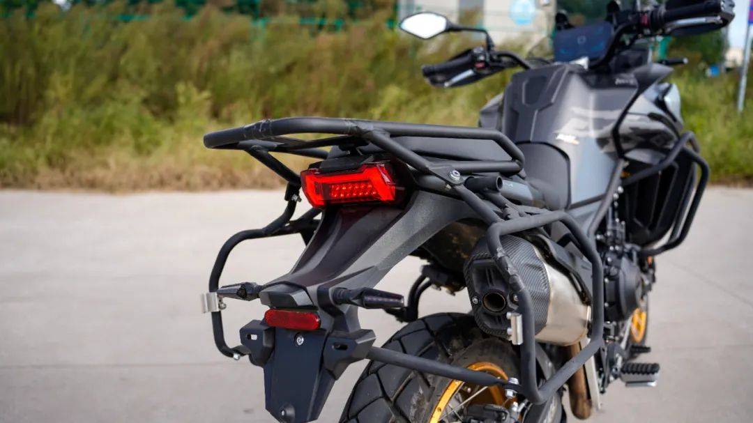 避震器搭载了KYB全可调倒置前叉(174mm行程)+多连杆外置气囊后减震(181mm行程),支持预载回弹压缩多段调节,驾驶者可以根据自身条件进行适配。日信双活塞径向卡钳配298mm双碟盘,标配双通道ABS+TCS,主流配置水准。象牌多功能轮胎,前110/80-R19,后150/70-R17,搭配辐条轮毂,成功减轻了簧下质量,最大离地间隙220mm,通过性足够硬核。