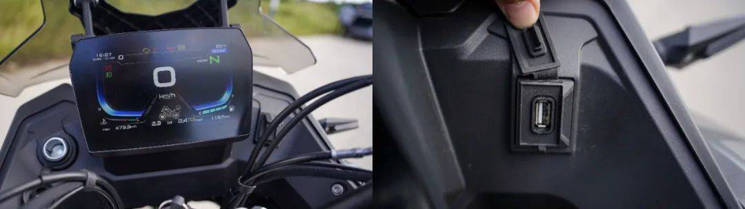 仪表左侧设置了点烟器接口,最大功率120w,足够为充气泵等设备供电,仪表右侧单独设置了USB接口。油箱容积18升,续航可以达400公里以上。