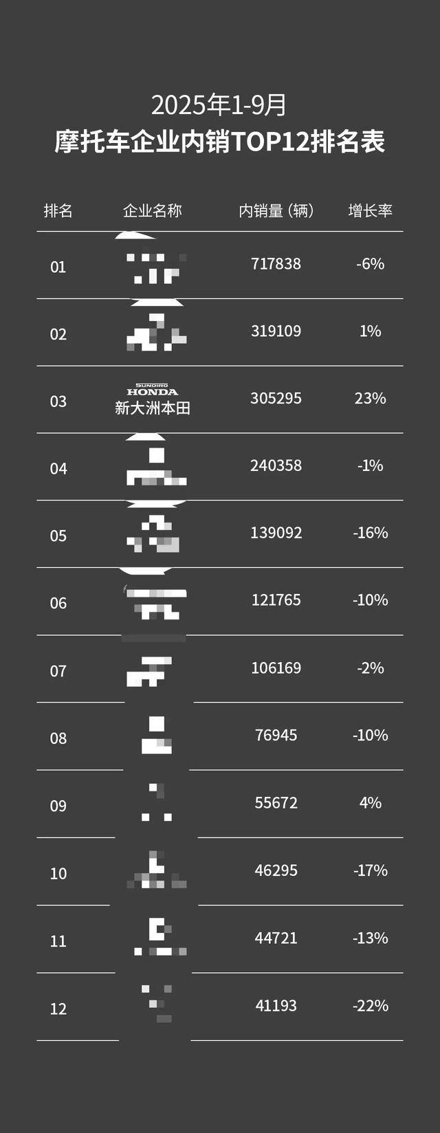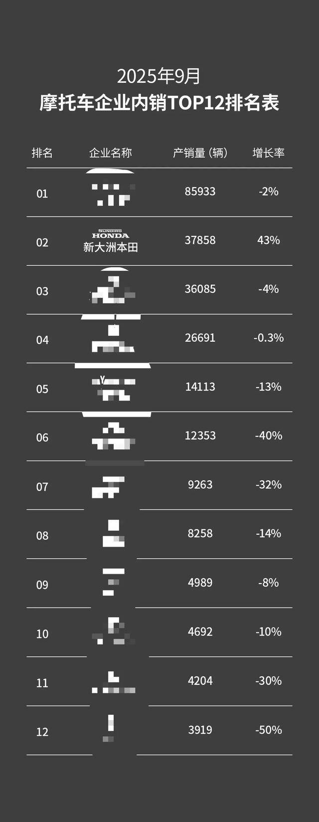 如果你认为笔者上述言论纯属胡说八道,相信新大洲本田现在的表现一定会“怼”得你哑口无言。先让我们来看看2025年1至9月国内摩市的销量排名。截至2025年9月底,新大洲本田的国内销量为305295辆,位居全行业第三名,其中,9月的销量达到37858辆,居全行业第二名。
