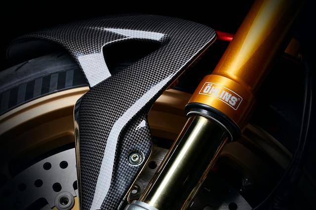 8、标配了与 Termignoni 共同开发的钛合金制排气系统,锻造铝合金制的前后车轮;碳纤维制的前、后轮挡泥板,发动机侧护盖;