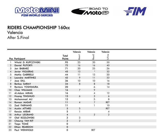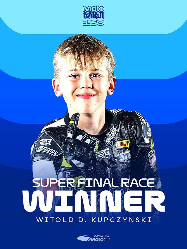 160 级别,黄霆诺、张恩榤进入最后的正赛环节。在两节比赛里,驾驶 17 号车的黄霆诺分别夺得了第十和第十三名,49 号车的张恩榤则分别获得了第十四和第二十一名;超级总决赛,黄霆诺夺得了第十三名,而张恩榤则以第十九名完赛。最终,黄霆诺在 160 级别获得了第十二名,张恩榤拿到了第二十名。而这一级别的总冠军,是今年十岁、驾驶 51 号车的波兰车手库普钦斯基(Witold Dariusz Kupczynski)。