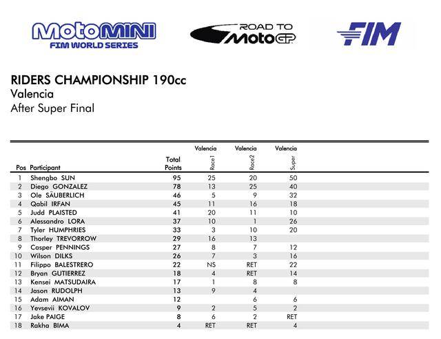 190 级别,凭借着出色的发挥,驾驶 82 号车的孙圣博,夺得了第一节比赛的冠军、第二节比赛的亚军,并以领先后车超过 1 秒的优势夺得了超级总决赛的冠军。最终,孙圣博拿到了近乎满分的 95 分(满分为 100 分)、以绝对的优势夺得了这个最高级别的总冠军 —— 这是中国车手历史性地、首次在 FIM 级别的公路型摩托车大赛里拿下的首个世界冠军。