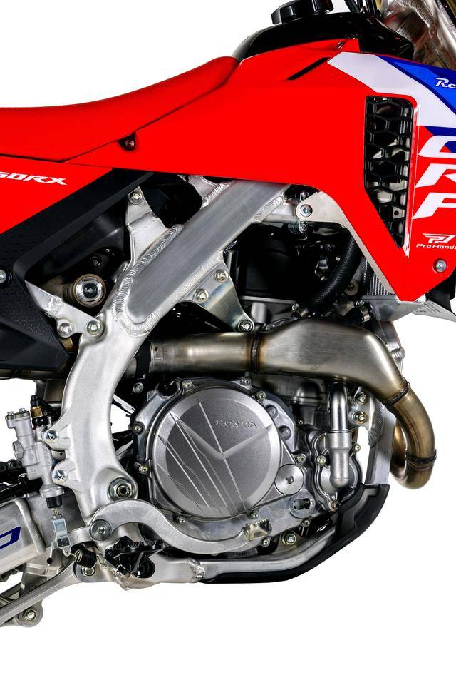 2026 CRF 450RX Supermoto 搭载一副与市售越野赛车 CRF450R 同平台的水冷四冲程单汽缸、SOHC(Unicam)四汽阀的发动机,缸径、行程为 96 mm x 62.1mm,排气量 449.7 cc,五档的变速齿轮箱。厂方未公布该车的最大动力输出,而这一级别车型、普遍的峰值马力输出是 60 匹以上。