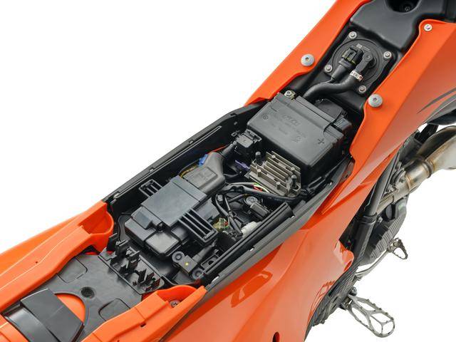 车体方面,沿用了现行 2025 款的钢制车架,WP 配套的 XACT 前后悬挂系统,Brembo 布雷博的制动系统,前 16.5、后 17 英寸直径的车轮,容量为 7.2 公升的油箱等。电子辅助系统方面,标配了起步弹射控制、牵引力控制、快速换档系统。