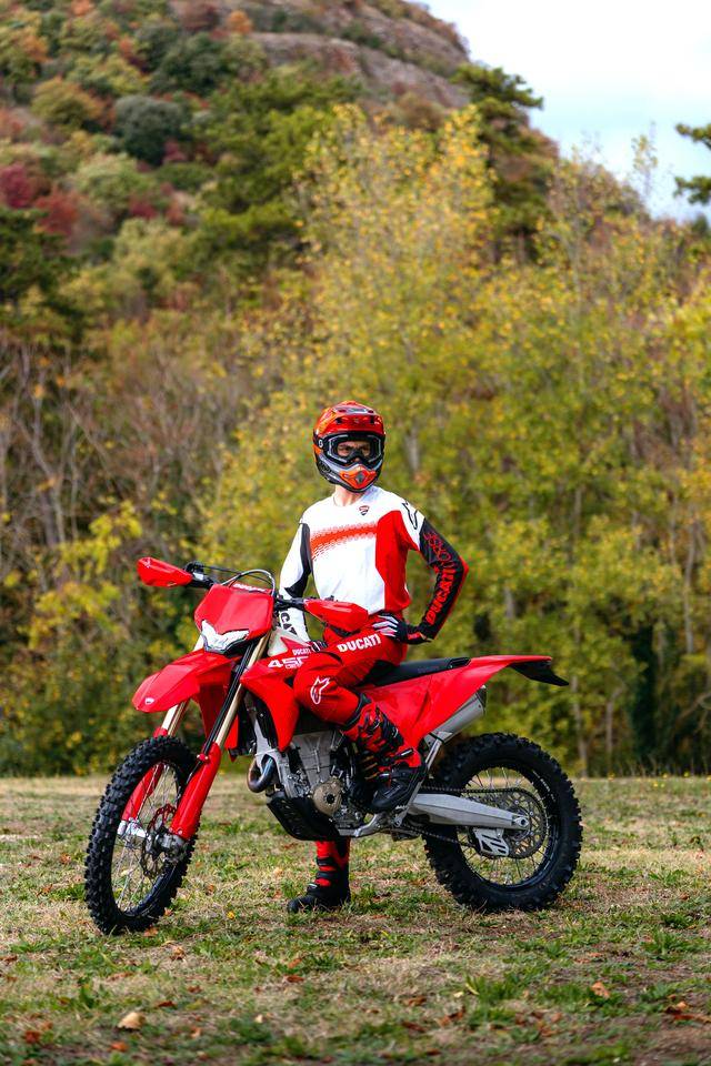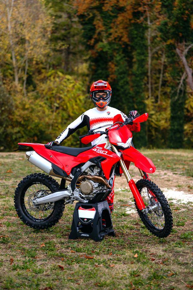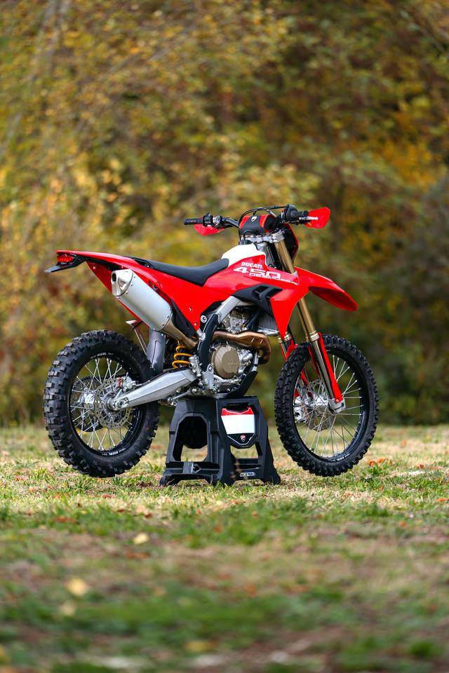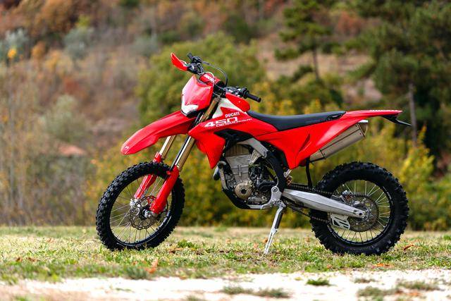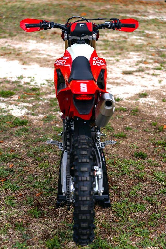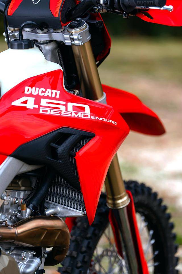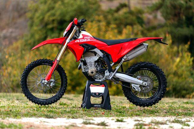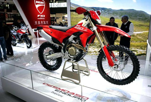 杜卡迪在今年四月正式发布了属于 MX(Motocross,场地越野)规格的全新市售越野赛车 Desmo450 MX,这是杜卡迪历史上的第一款市售越野赛车。市售规格的 Desmo450 MX 搭载一副水冷四冲程单气缸、DOHC 四气阀、Desmodromic 气阀正时控制(轴控制气阀,而常见的气阀开合控制组件是弹簧)的发动机,缸径、行程为 96 mm x 62.1 mm,排气量 449.6 cc,峰值动力输出 46.7 kw(约 63.5 匹)/9400 rpm,最大扭矩输出 53.5 N.m/7500 rpm。