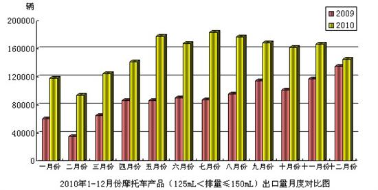 2010年12月份摩托车产品(125mL<排量≤150mL)出口14.53万辆,比去年同期增长了7.60%;出口金额0.70亿美元,比去年同期增长了10.93%。