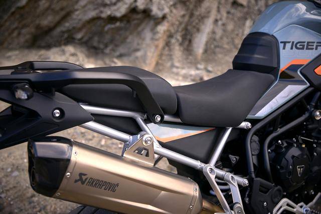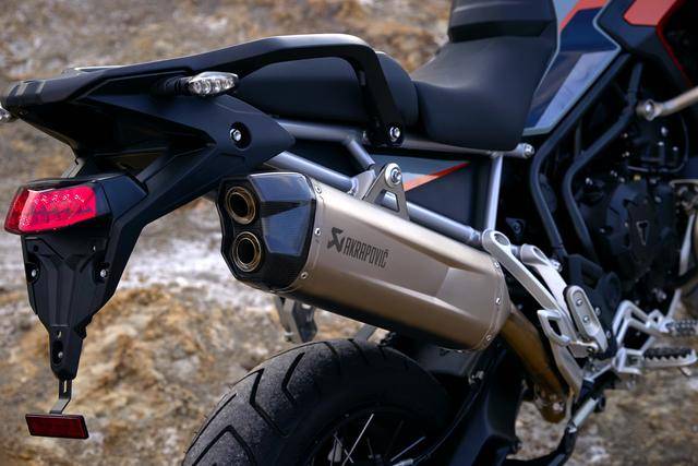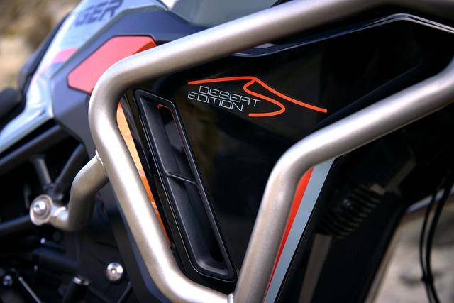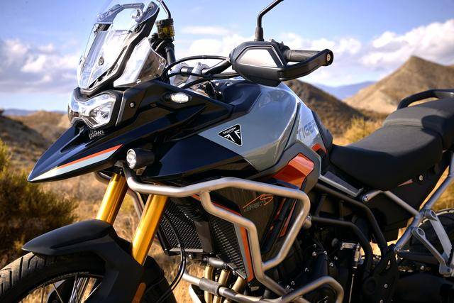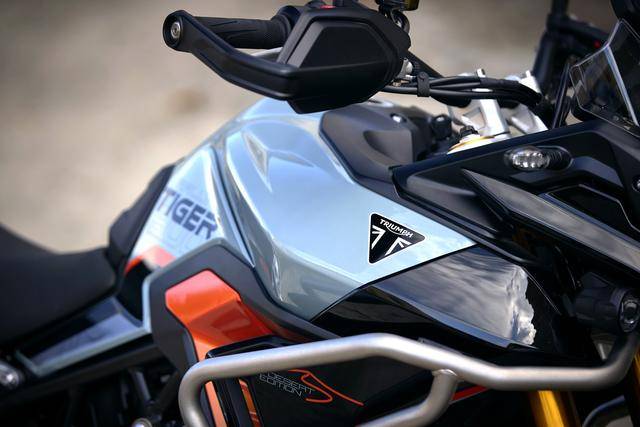 * 与 Rally Pro 版相比,新的 Tiger 900 Desert 沙漠版同样标配了 Akrapovic 阿克拉波维奇的排气管,车身的前部加装了全套的两侧护架,采用了一个专属的车身图案。