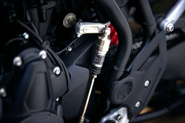 * 标配了 Showa 的前后悬挂系统,前面是叉芯口径为 45 mm、标准行程为 240 mm 的倒立式前叉, 后面是标准行程为 230 mm 的单筒式后减震;