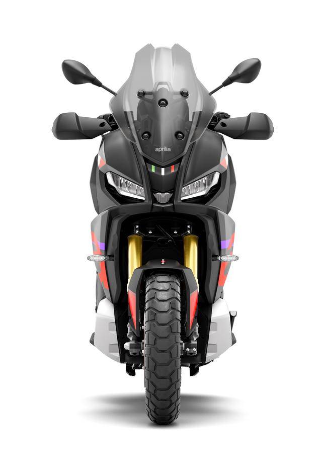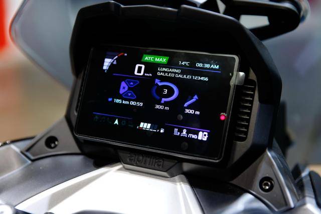 5、外观造型上,采用了一个阿普利亚运动车型 + 探险车的混合体风格,前 LED 大灯的轮廓可让人想到他们的 RSV,较高的前风挡、车把两端的护罩则是一个典型的探险车风格;手动可调的前风挡,在 70 mm 的调节范围内、提供五级选择;