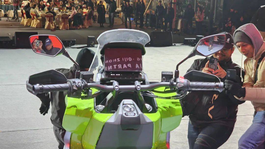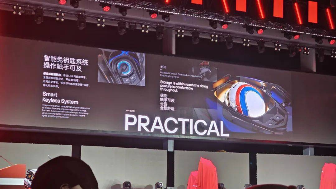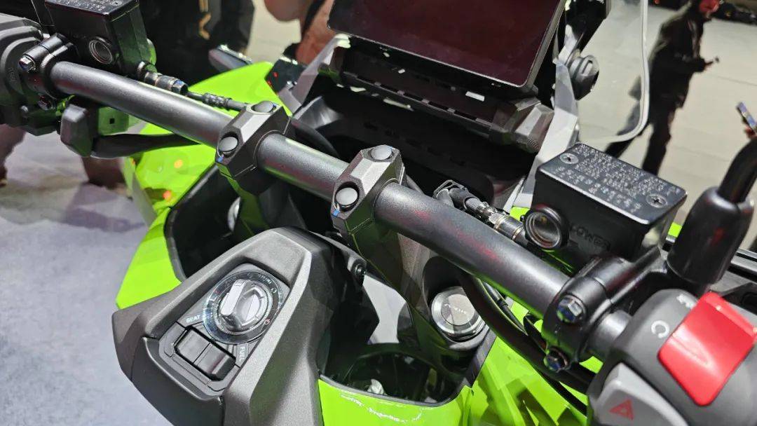 在功能配置上,现场能看到可调节的风挡、车把护手,大尺寸仪表,无钥匙启动,一键开启的座桶/油箱盖,以及ADV大踏板必备的,裸把+上下双连板的搭配。