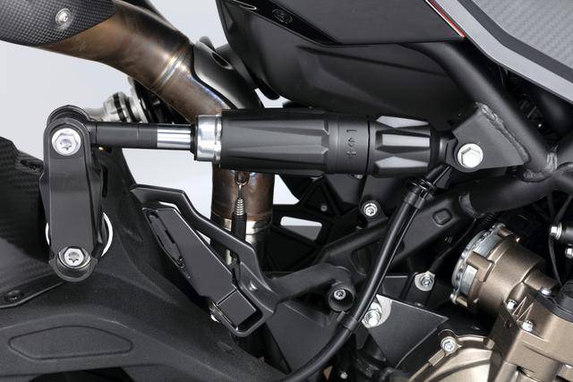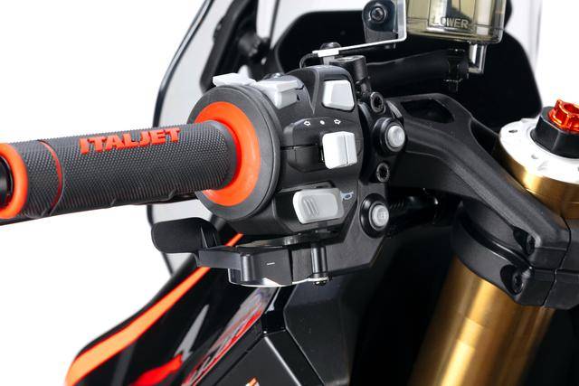 4、另一个的标志性装备是名为 ISAS(Italjet Stiffness Adjustment System,Italjet 刚度调节系统)的后减震辅助调节系统。该系统位于车体后右侧(后减震位于后左侧),用于供骑士对后减震的软硬程度进行微调,以适应不同的当前骑行条件和骑乘风格;