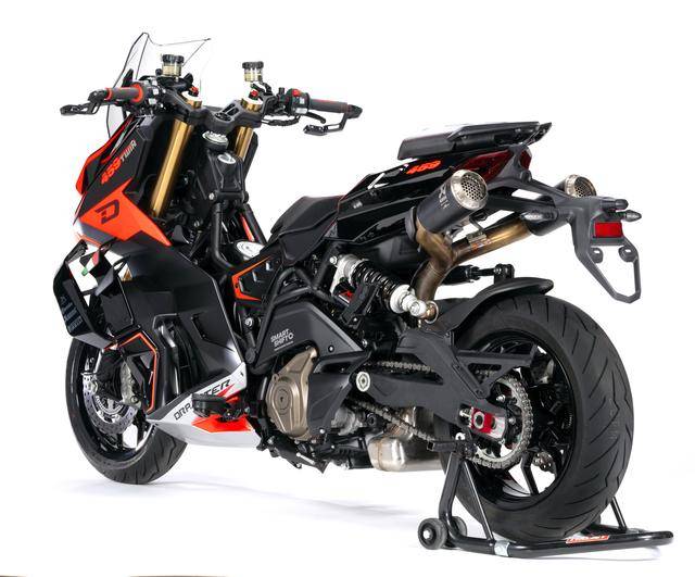 3、车体方面,主要结构与在售的 700 Twin 相同,外观造型的风格相近,采用一副钢管编织式的车架,Marzocchi 配套的倒立式前叉和后减震(700 Twin 采用 Ohlins 奥林斯配套的后减震和转向阻尼器),Brembo 布雷博配套的前后制动系统、标配了 ABS,相同轮胎规格的前后 15 英寸直径车轮;