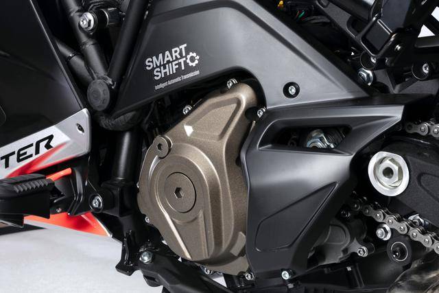 2、标志性的装备之一,是六档的变速齿轮箱配备了名为 SmartShift(Intelligent Automatic Transmission,智能化自动变速齿轮箱)的自动换档系统,该系统去掉了惯常左手的离合器和左脚换档杆,内置了以 ECU 控制的电子离合器和齿轮动作控制结构,实现智能化的自动换档、或者是无离合操作之下的手动换档(通过位于左边车把上的 +/- 按键进行手动换档)。厂方称,该系统将手动变速箱的精度、与全自动变速箱的便利性融为了一体;