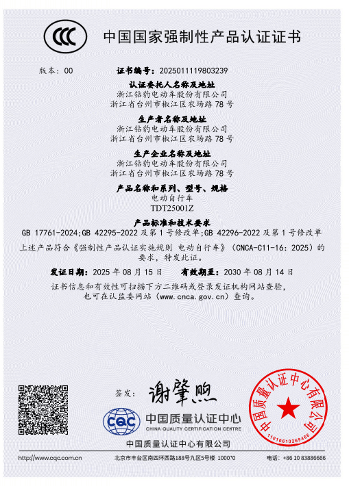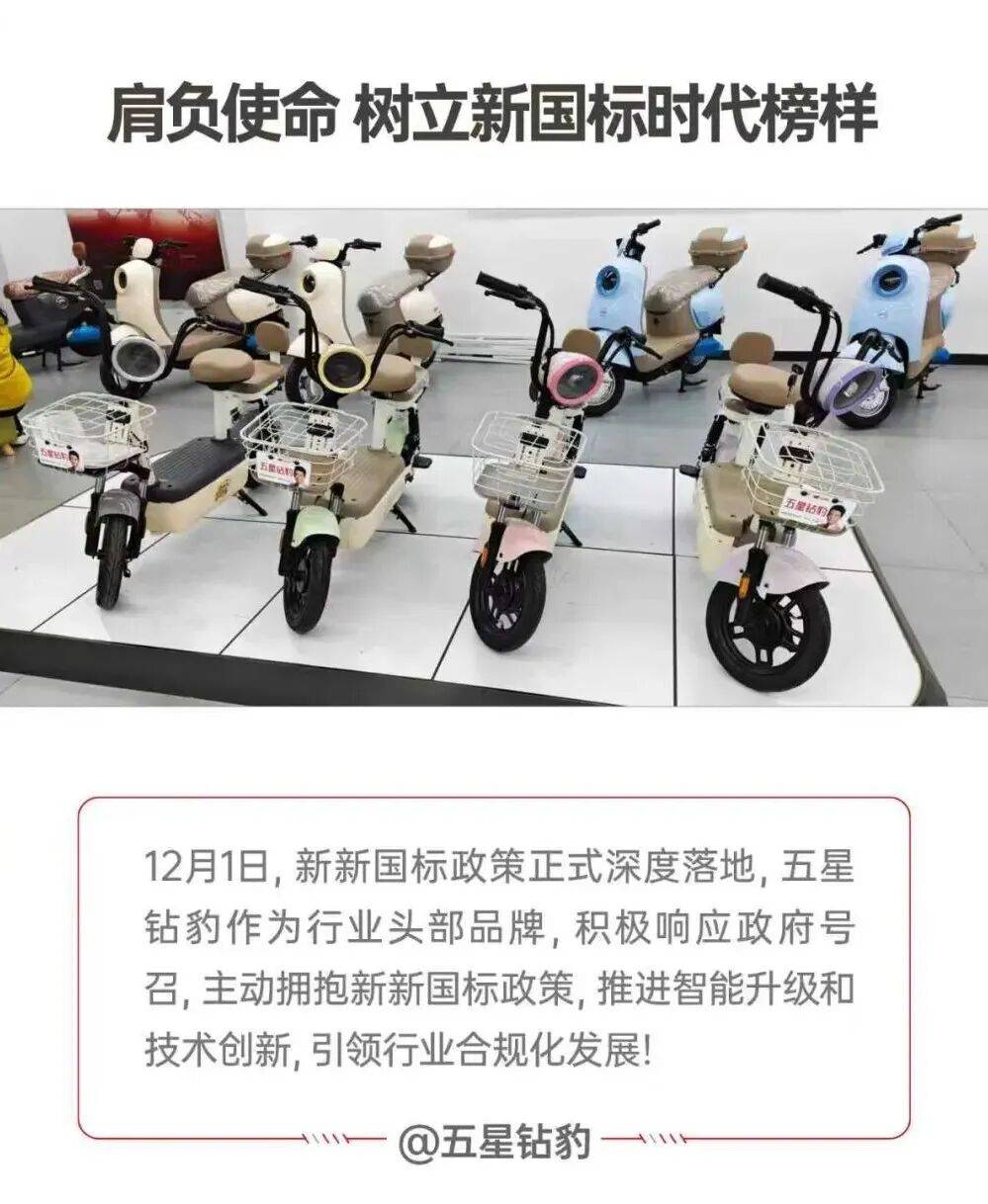 五星钻豹作为新新国标政策的大力推动者,是高质量践行者,更是国家严选品牌,成功入选工信部《电动自行车行业规范条件》白名单的企业之一,并迅速响应新国标3C认证,率先获得 GB 17761-2024 新国标产品认证证书,获得权威认可,体现出全面领先的实力!