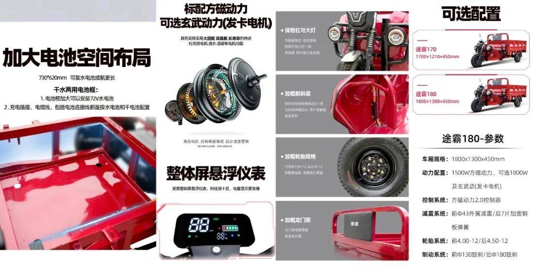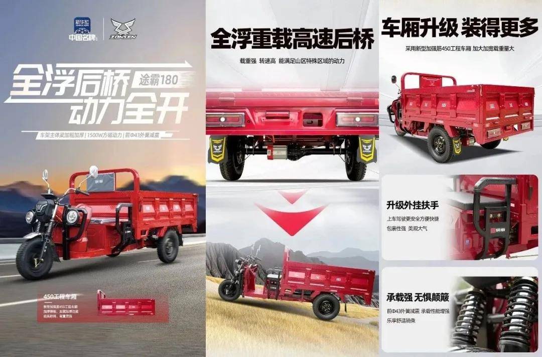 宗申途霸180作为途霸系列的主推型号,专为乡镇山野的复杂路况打造,在山区运输、陡坡作业场景中表现亮眼。主要得益于其电机动力达1500W(最高可选1800W发卡电机),再搭配上品牌专属玄武动力系统,使车辆理论性能提升75%,即使是满载爬坡依旧轻松。