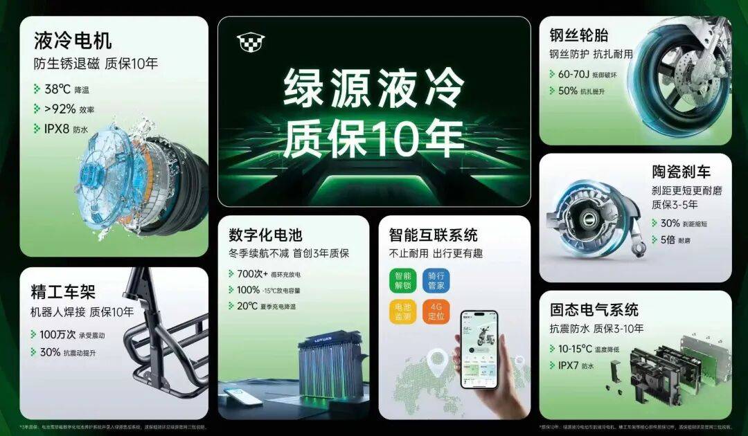 2023年,绿源推出数字化电池养护系统,有效提升了电池的冬季续航、寿命与安全性,并且行业首创铅酸电池3年质保;同步推出核心电气件一体封装的固态电气系统,高效散热防水抗震,质保3-10年。同年,绿源在旗舰车型S90上,实现了液冷电机、数字化电池、固态电气系统三大技术的全面整合,形成了独有的“三电协同”生态。绿源将电动车的耐用性从单件突破,升维到动力、续航、安全性的全局系统化可靠阶段。目前围绕“一部车骑10年”,绿源已构建起涵盖液冷动力、数字化、固态电气、安全制动、精工车架等五大核心技术矩阵。