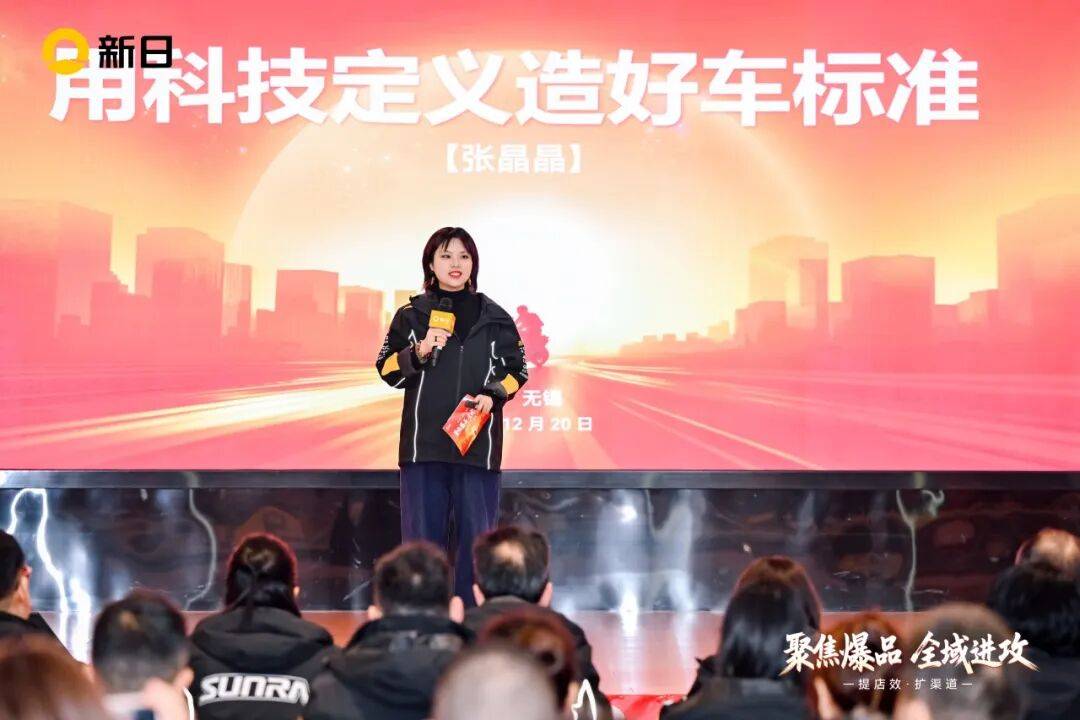 新日股份董事、智能中心总经理张晶晶在大会上分享:“新日27年专研,坚持科技普惠,不断引领提升,用科技定义造好车标准”。
