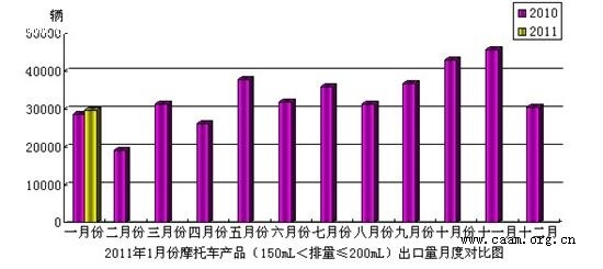据海关提供出口统计数据显示,由中国汽车工业协会编辑整理,现将2011年1月份摩托车产品(150mL<排量≤200mL)出口情况分析如下: