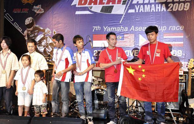 下面的图片,2009 亚洲国家杯印尼站、颁奖晚会上的中国代表队车手。在 2009、2010 年间举行的亚洲国家杯,大部分比赛里、中国代表队均由宗申支持的车手组成。