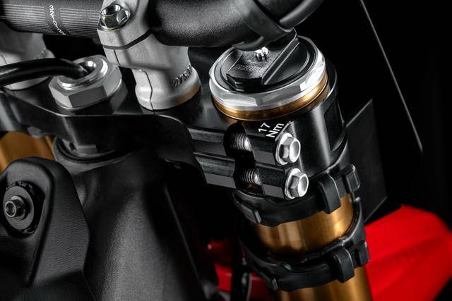 4、换装了 Ergal 配套的上下三星(前叉三角台),该组件的表面采用了黑色阳极氧化处理(标准款采用铝合金原色的银灰色),重量也比标准款的同组件降低了大约 200 克;
