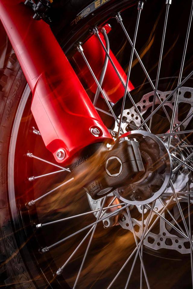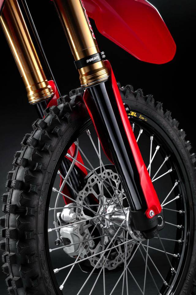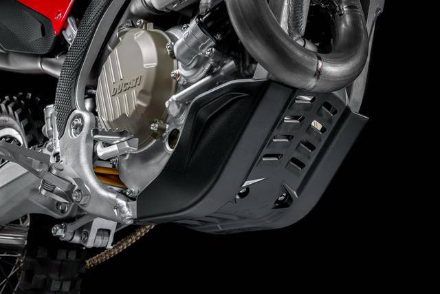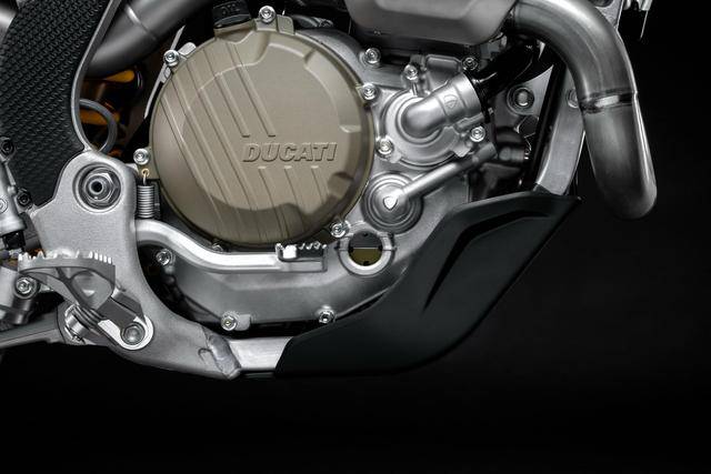 1、与标准版相同的水冷四冲程单气缸、DOHC四气阀、Desmodromic 气阀正时控制(轴控制气阀,而常见的气阀开合控制组件是弹簧)发动机,缸径、行程为 96 mm x 62.1 mm,排气量 449.6 cc,峰值动力输出 46.7 kw(约 63.5 匹)/9400 rpm,最大扭矩输出 53.5 N.m/7500 rpm。维护标准为每使用 45 小时更换活塞、每使用 45 小时检查气门间隙,而发动机大修的间隔设定为 90 小时;
