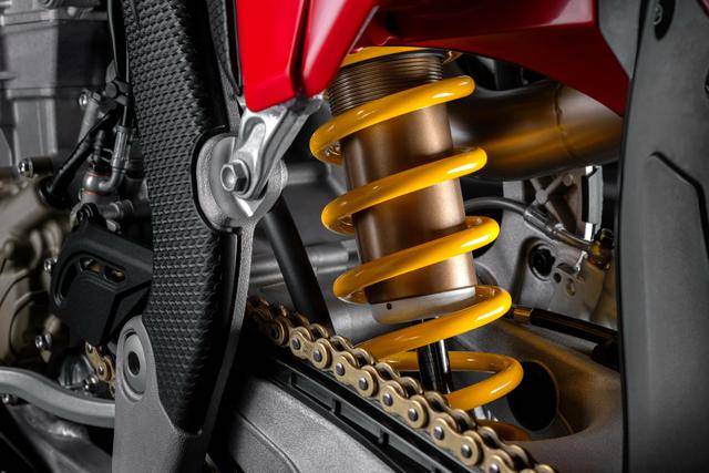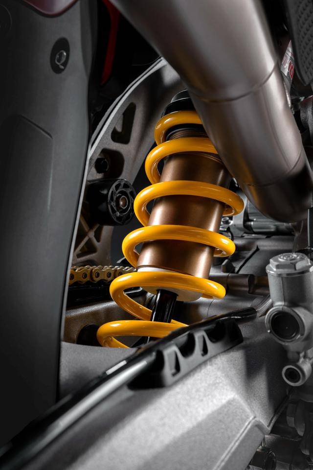 3、与标准款相同的、重量只有 8.95 公斤的铝合金制双翼樑车架,铝合金制的后摇臂;工厂版在车架/底盘的标志性变化,是换装了与 Showa 共同开发的、具有更强性能的前后悬挂系统:前 310 mm、后 301 mm 的悬挂标准行程保持不变,前面是叉芯口径为 49 mm 的倒立式前叉,后单筒式的后减震,均有着全可调功能,前叉芯、后减震器杆都采用了氧化钛处理和超精加工、令表面强度提高了大约 60%,从而提高了悬挂系统的耐磨性和通过砾碎石路面时的抗损性;而采用了特殊表面涂层的叉芯和减震杆,强化了对颠簸的处理、以提高操控的平稳性;