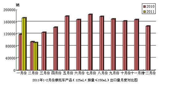 据海关提供出口统计数据显示,由中国汽车工业协会编辑整理,现将2011年2月份摩托车产品(125mL<排量≤150mL)出口情况分析如下: