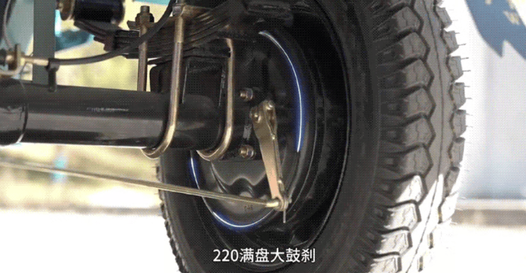 700mm宽车架配合加粗前斜管,满载状态下保持出色抗扭稳定性。前悬外簧减震与后部多片钢板弹簧组合,有效消化坑洼路面震动,货物不晃、驾驶更踏实。加粗轮轴与大规格轮胎增强雨后土路抓地力。